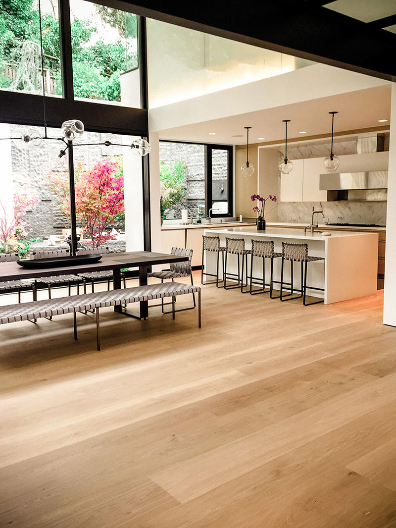 For this beautiful Cole Valley home we used European Oak with width of 12″ and length ranging from 6′ to 18′. The finish is water based urethane with a natural color.